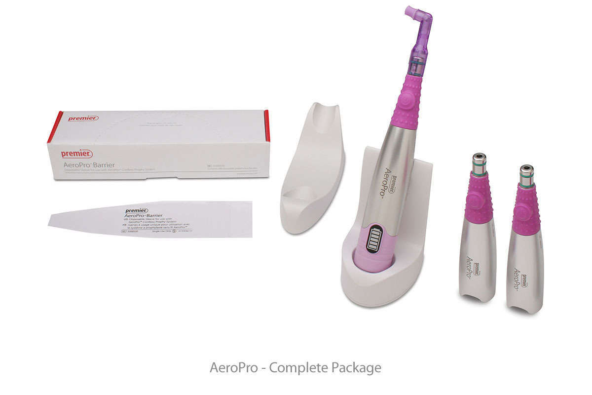 AeroPro Complete Package Contains: 1 Motor Component, 3 Autoclavable Outer Sheaths, 1 Charging Station, 1 AC Adapter, 1 Box of 500 Disposable Barriers, 288 2pro® Disposable Prophy Angles (Short/Soft)